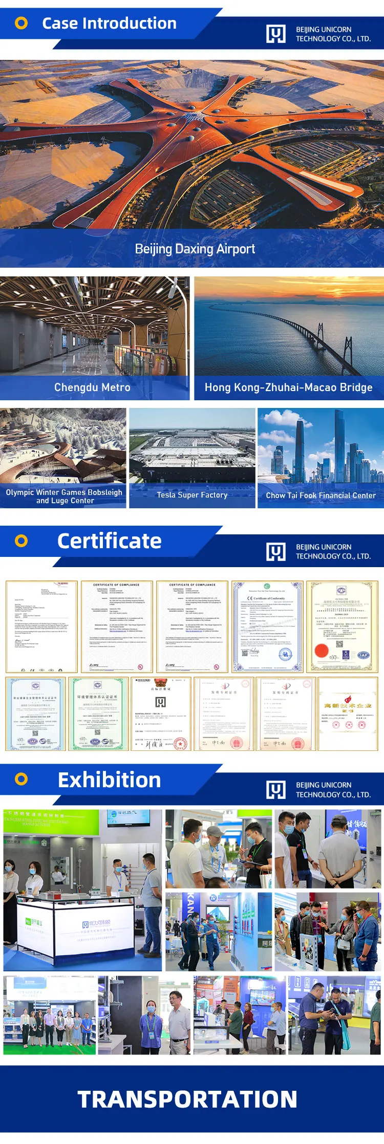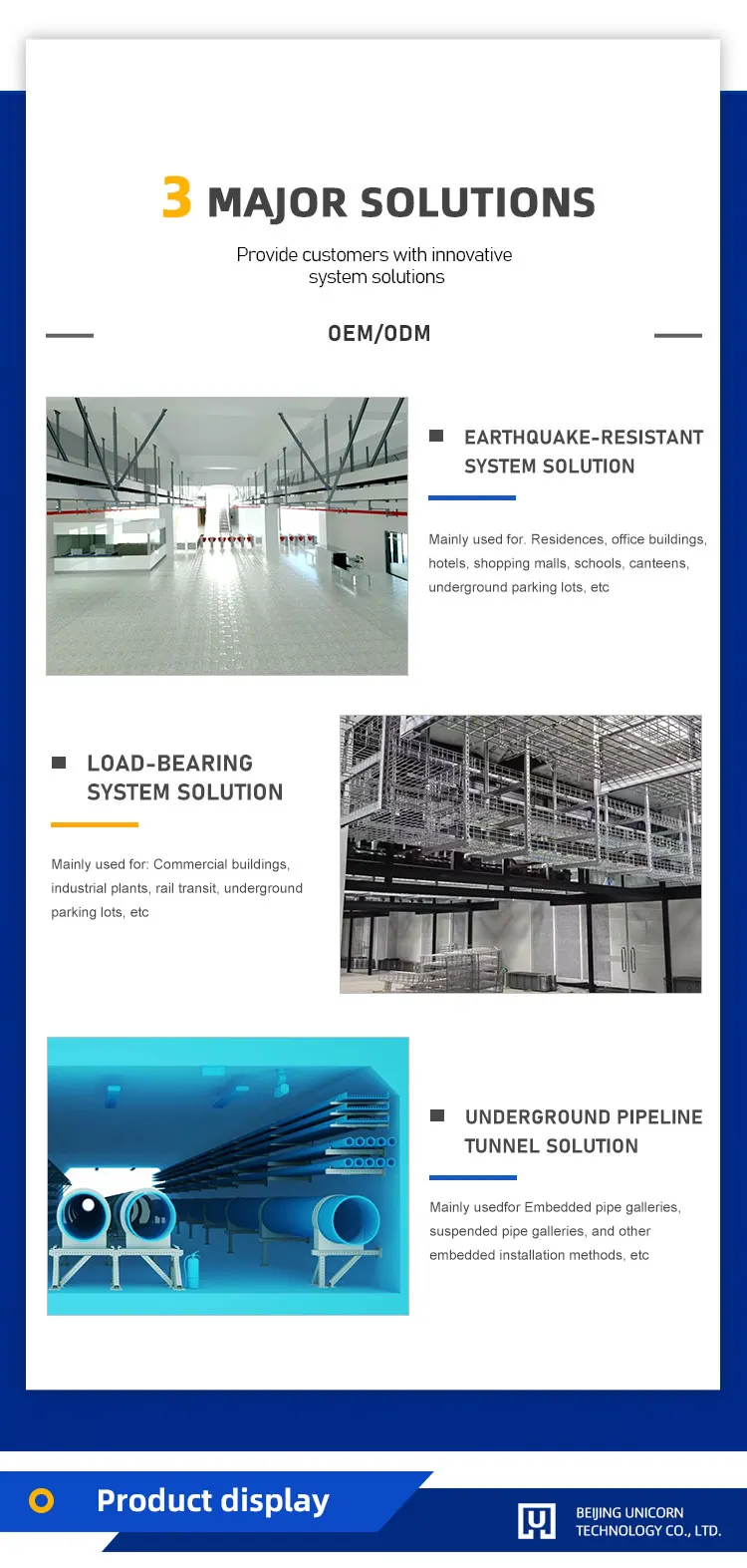 Unicorn Technology is a national high-tech enterprise. It has obtained international certifications such as FM, UL, and CE, and has been awarded more than 80 national patents. The company focuses on the R&D, design, production, and sales of prefabricated support and hanger systems for building electromechanics. Founded in 2012, it is headquartered in Shenzhen. In 2017, it established a liaison office in Beijing, and in 2018,it set up a production base in Foshan, Guangdong.